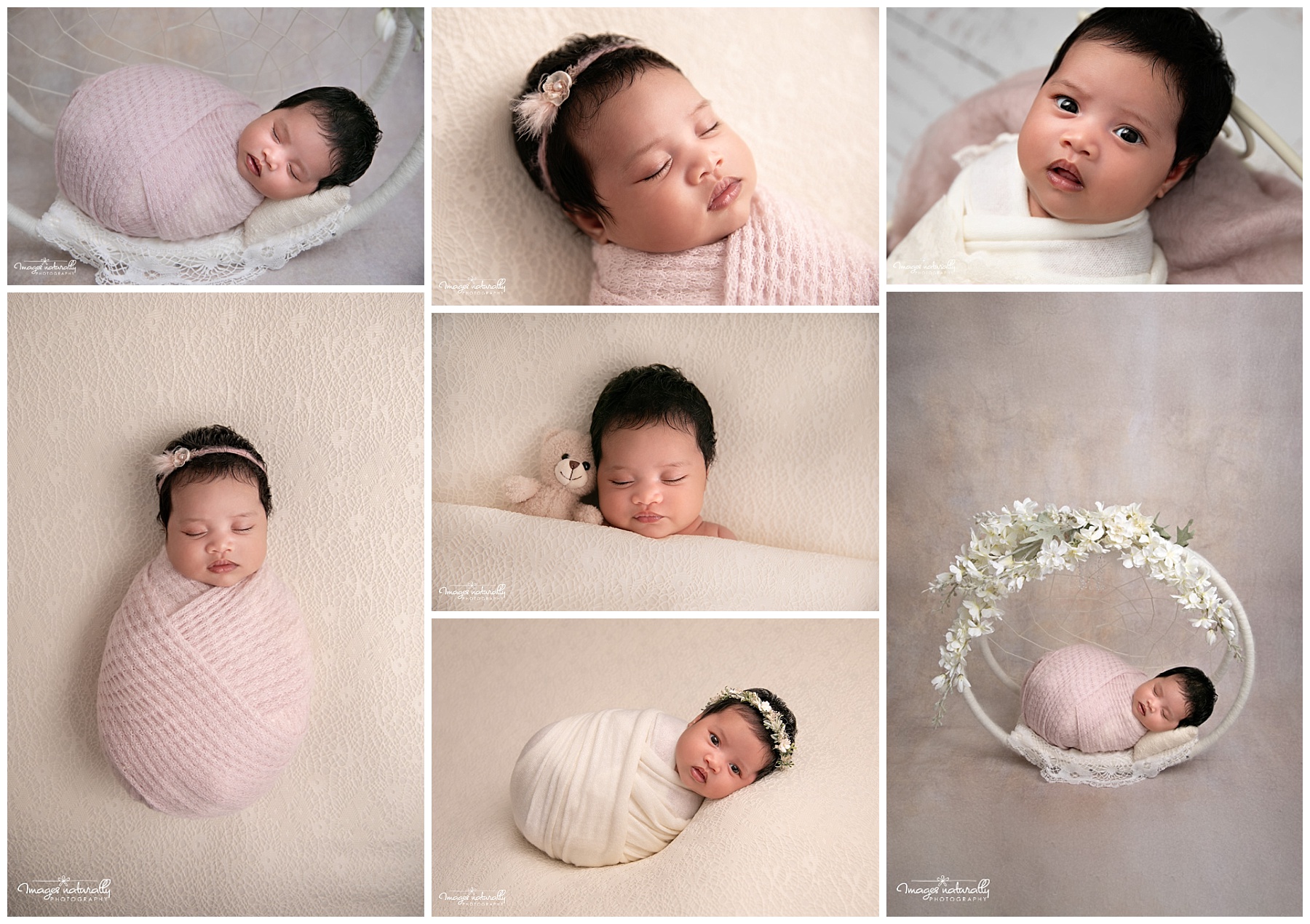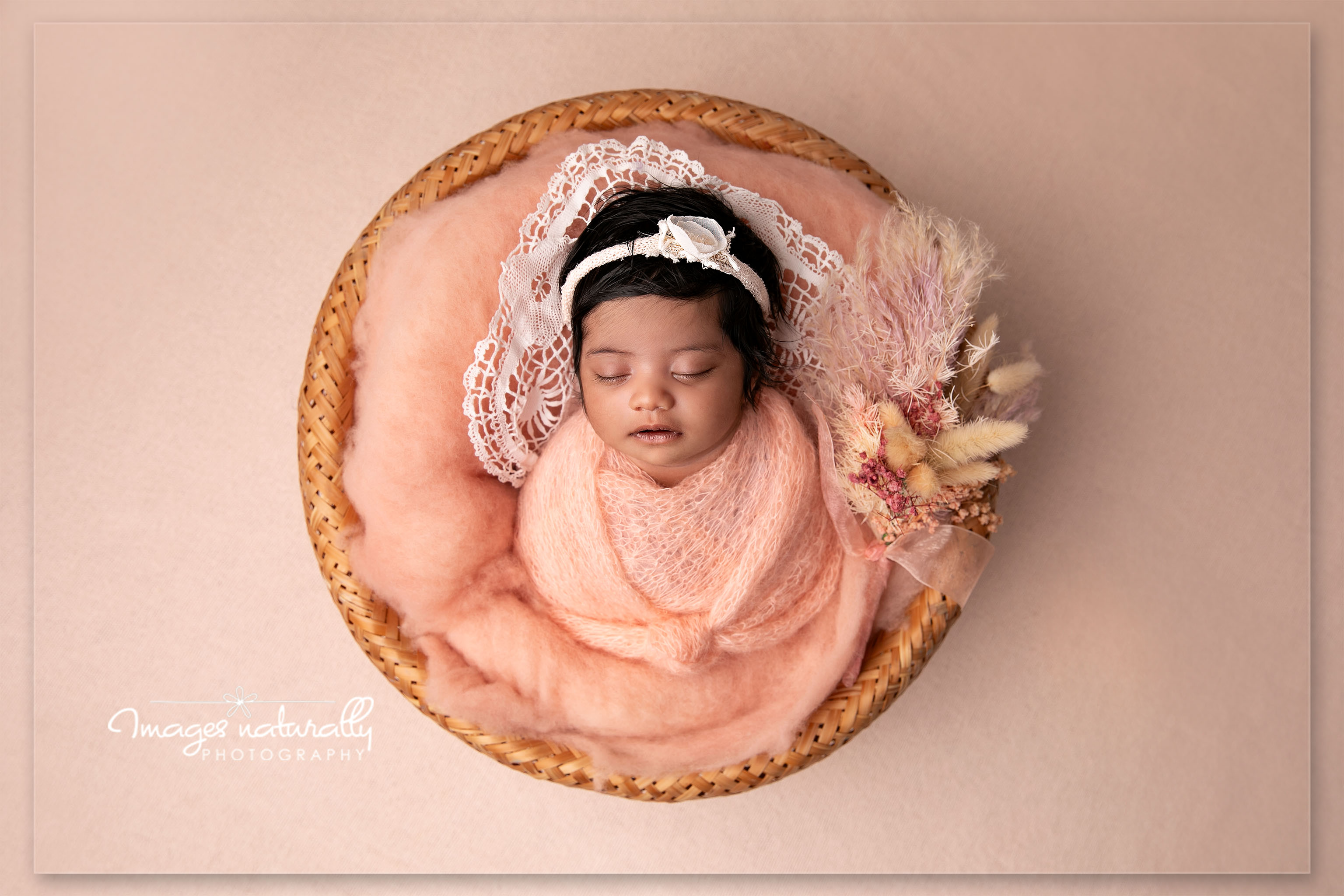 This morning's baby girl slept like a little angel for her photoshoot this morning. She hasn't been sleeping very well at home, so Mum was thrilled that she was so calm. We kept to a mostly white photoshoot with a little pink. And of course added some blossom....